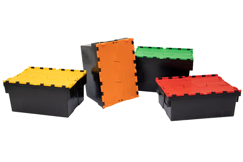 - Einzigartiges Deckeldesign: lässt sich beim Stapeln vollständig flach neben den Behälter klappen, wodurch Beschädigungen am Behälter reduziert werden und zusätzlicher Platz beim Rücktransport gespart wird