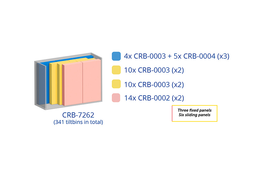 - Integrierte Kippbehältermodule pro verschiebbarer Platte: 14x CRB-0002 (x2) + 10x CRB-0003 (x4)