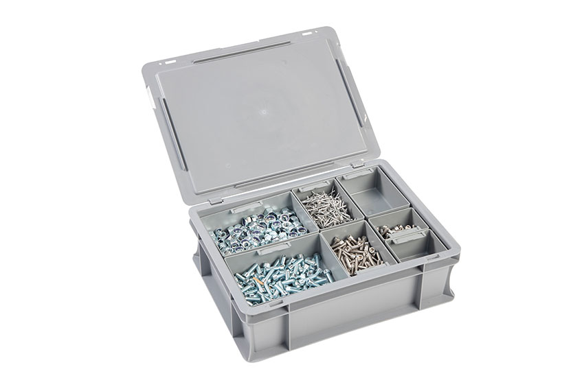 - Euronorm case with hinged lid, 2 sealing clips and ergonomic handle